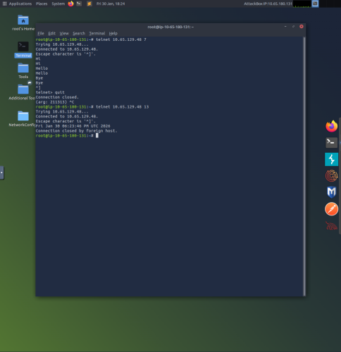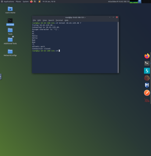 1. Launch Terminal on Linux system and use the command “telnet 10.65.129.48 7”. This connects to the target VM (IP address) and the command 7 uses the echo server service, which will echo back whatever is typed into Terminal.