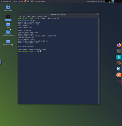 3. The “telnet 10.65.129.48 80” command connects to a web(http) server. Type “GET / HTTP/1.1”, press enter, type “Host: telnet.thm”, and then press enter twice to see useful information about the web server.