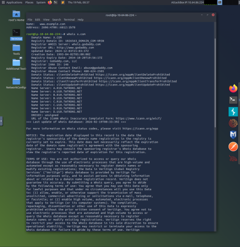 2. Using the command whois provides useful records of any registered domain name (in this case x.com). Whois provides information about the entity that registered the domain, phone number, email, and address.