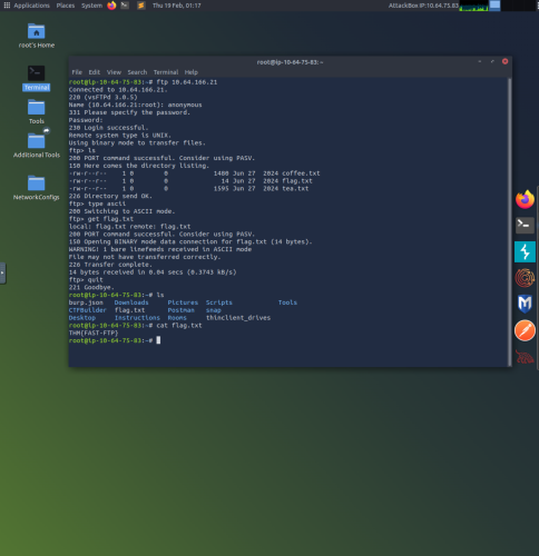 4. The File Transfer Protocol (FTP) is used to transfer files. This example uses “ftp 10.64.166.21” to connect to the file server at 10.64.166.21. After giving the appropriate login credentials, the ls command lists the contents of the directory. The command “type ascii” enables ascii mode in order to access text files, and the “get flag.txt” uses FTP to transfer the flag.txt file. The “quit” command exits FTP, and using the ls command shows the flag.txt file has been successfully transferred. Finally the concatenate command “cat flag.txt” prints out the contents of the desired txt file.