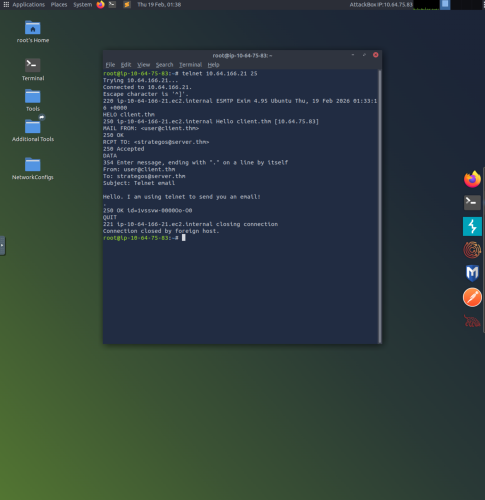 5. This example uses “telnet 10.64.166.21 25” in order to connect to Simple Mail Transfer Protocol (SMTP) on TCP port 25. the “HELO client.thm” is used to initiate an SMTP session, “MAIL FROM; <us**@cl****.thm>” specifies the sender’s email address, and “RCPT TO: <st*******@se****.thm>” specifies the recipients email address. The DATA command is used to begin sending the email, and a single “.” is used to indicate the end of the email message.