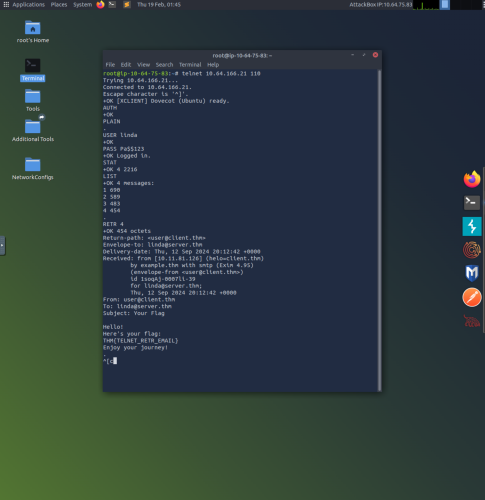 6.  This example uses “telnet 10.64.166.21 110” to connect to Post Office Protocol version 3 (POP3) over TCP port 110. Here the “USER linda” command is used to login as linda using “PASS Pa$$123” as the password. Once logged in, the command STAT requests the number of messages, and LIST lists all messages. The “RETR 4” command retrieves the 4th email message and displays its contents.