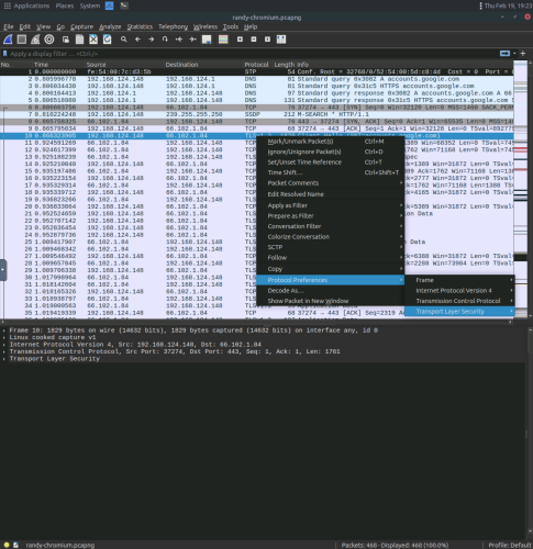3. Right clicking a network packet gives a list of useful options, and this example shows the Transport Layer Security (TLS) under protocol preferences.