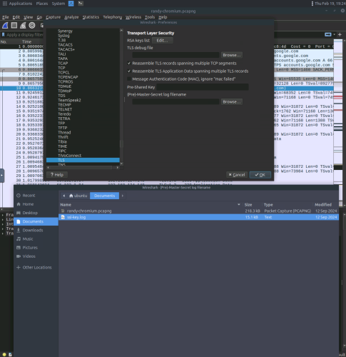 4. The TLS preferences gives an option to include a (pre)-Master-Secret log filename, and in this case the “ssl-key.log” file. This allows the user to view the contents of encrypted packets.
