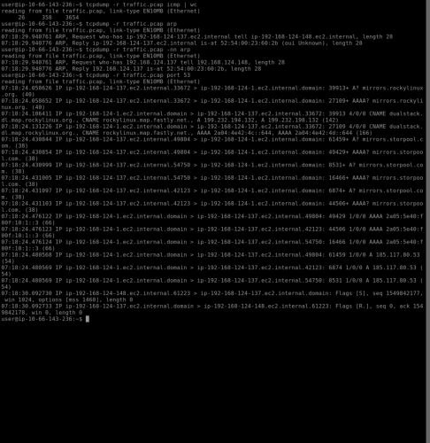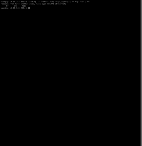 4. This example uses the command “tcpdump -r traffic.pcap “tcp[tcpflags] == tcp-rst” | wc” to filter network traffic for TCP reset (RST) packets.