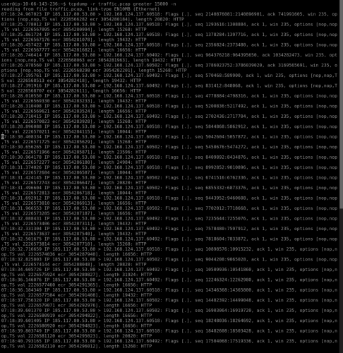 5. This example uses “tcpdump -r traffic.pcap greater 15000 -n” to filter for packets greater than 15,000 bytes and shows the corresponding IP addresses.