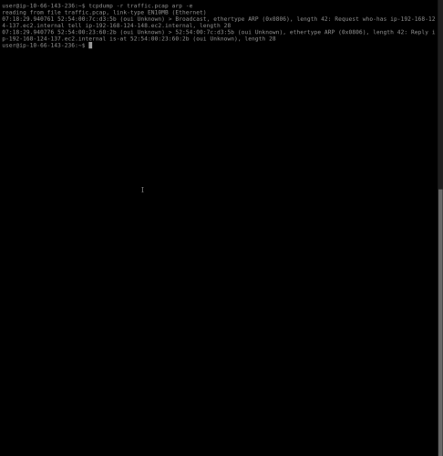 6. The final example uses “tcpdump -r traffic.pcap arp -e” which filters packets for ARP and the -e provides information on the source MAC address, the destination MAC address, and VLAN tags.