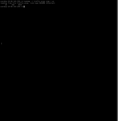 2. This example uses the command “tcpdump -r traffic.pcap icmp | wc” which reads the network traffic from the traffic.pcap file, filters only ICMP packets, and wc outputs 3 numbers. This is a simple way to determine the amount of ICMP packets, words and characters(bytes) contained within the capture file.