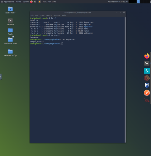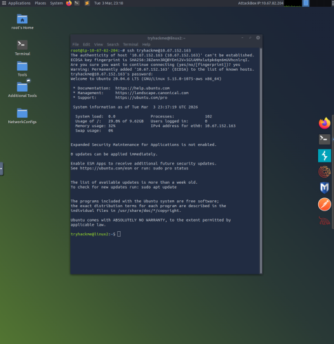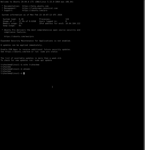 6. This example uses terminal in a version of Linux with a GUI. The Secure Shell (SSH) command is used to connect to and interact with the command line of a remote Linux machine. The command ssh tryhackme@10.67.152.163 uses the tryhackme credential to login at the associated IP address of 10.67.152.163. Once the password has been input, the command line can be run as the tryhackme user.