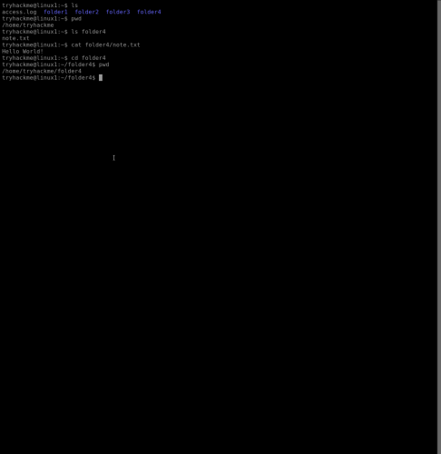 3. This example uses the command pwd to print the full path of the current working directory. The ls folder4 command reveals a note.txt, and the cat folder4/note.txt command will concatenate the note.txt in folder4 to output the contents of the text file.