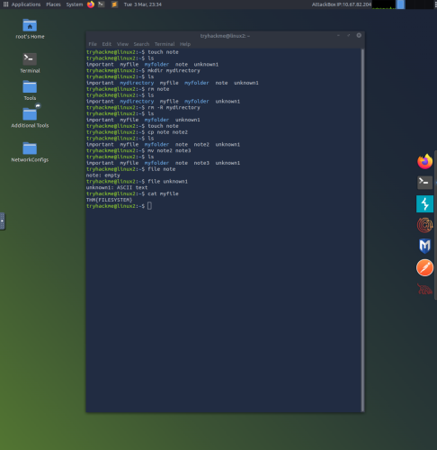 8. This example demonstrates the use of many different commands such as; touch (creates a file), mkdir (creates a directory), rm (removes a file), cp (copies a file), mv (moves and replaces files), and file (determines file type).